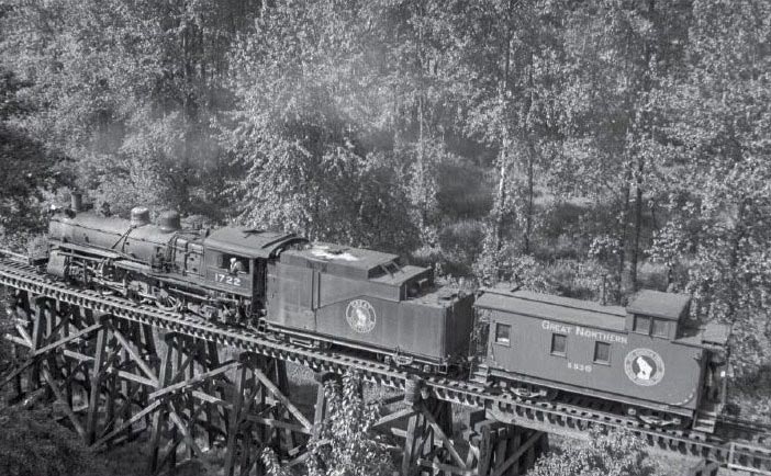 GN X630 departing Vancouver, British Columbia behind GN steam locomotive #1722 headed back to Everett, Washington. Date unknown. Claude Witt Collection, Courtesy of Great Northern Railway Historical Society.