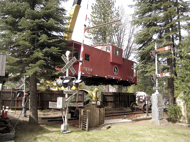 The big 50 ton Carlton crane lifting the caboose off its track and onto a flatbed truck for the drive to Black Butte