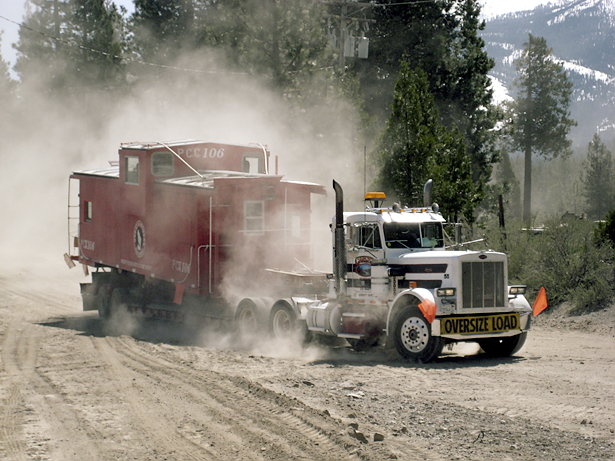 During later rebuildings, many BN extended vision cabooses, including #10772 were rebuilt and had steel plates welded over some of their windows. At some point #10772 was then retired off of BN and donated to the City of Palouse, WA where it housed the local chamber of commerce office. It was repainted in Great Northern colors and numbered X106. However, having been built for the BN, it was never actually a GN caboose. #10772 was acquired by a private owner who moved it to McCloud, CA in 2001 as part of a rail-oriented bed & breakfast lodge. It was restored and upgraded and has an almost "as new" look. We brought #10772 to Black Butte in May, 2011. Here are a few photos of the move: