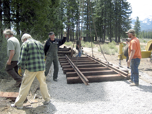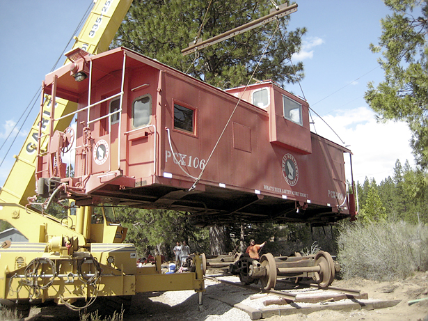 Once the trucks (wheelsets) are placed on the track the caboose is lifted off the lowboy and dropped onto the truck pins