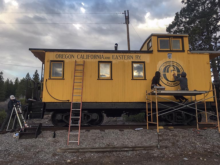 In April, 2019 the BBCRC's signpainter friends came and lettered the caboose for the Oregon, California and Eastern and applied its rarely-seen logo. In that BBCRC already had a restored GN 25' wood caboose on our site, we decided to keep X630 in the much rarer OC&E paint scheme. Maintaining the car's bright yellow paint, and thus the lettering, has been challenging given the sometimes harsh weather and UV light at BBCRC, requiring frequent touch-ups and repainting.